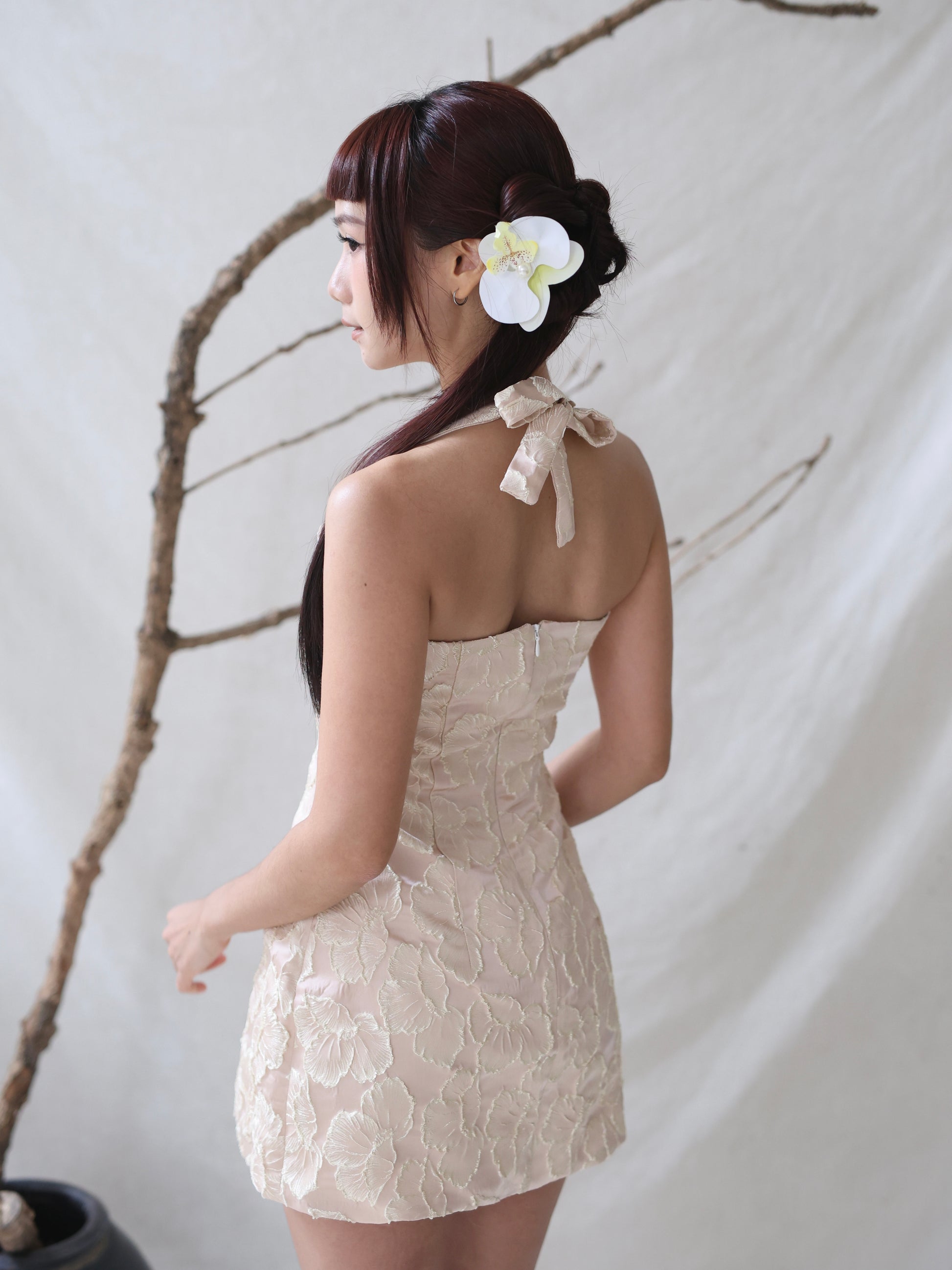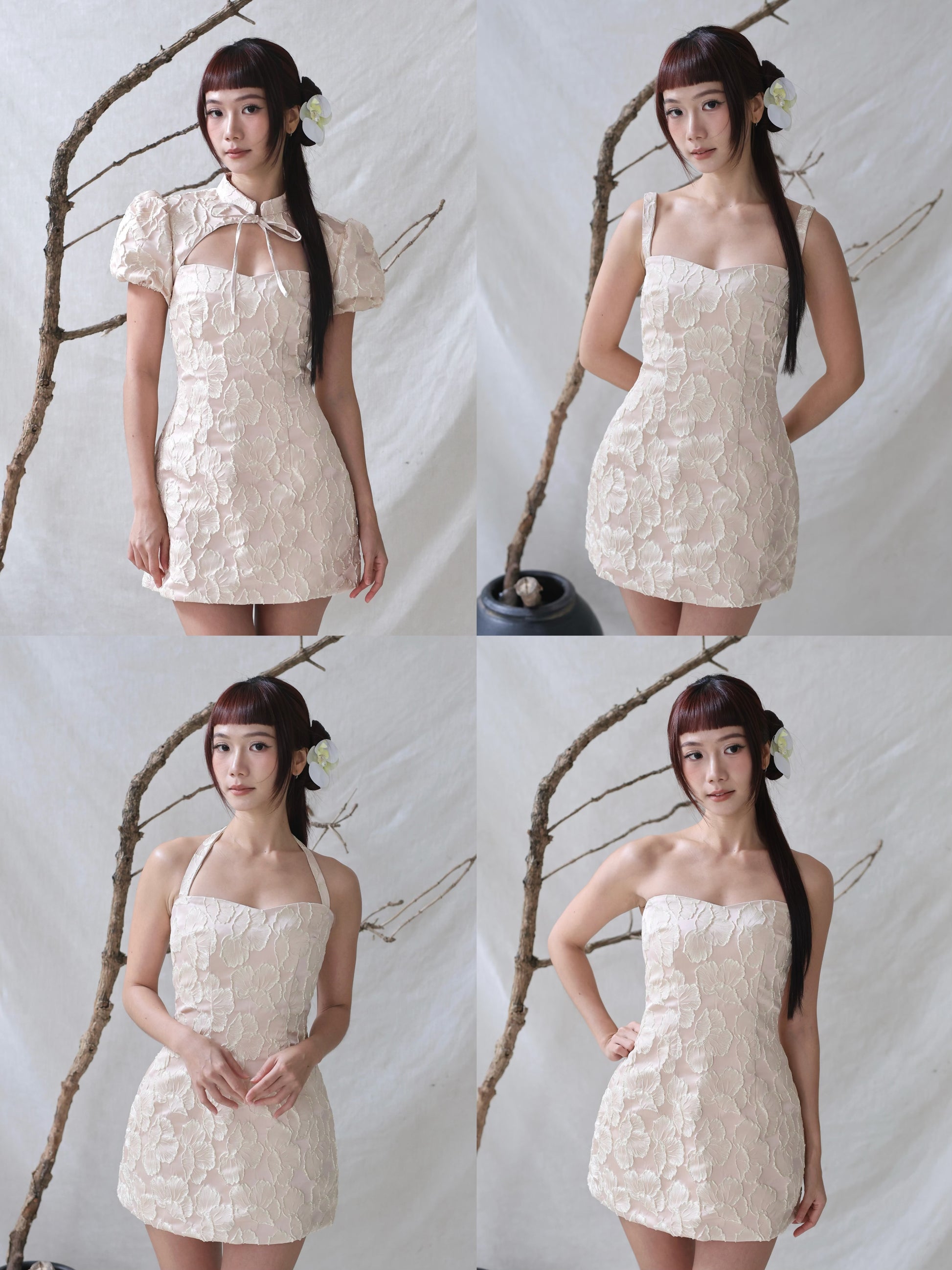 This Blaire mini dress blends traditional charm with modern styling in a chic 2-piece set that can be worn in four unique ways. It can be worn with the outer, halter tie-back, classic straps and tube bodice. Crafted in a soft baby blush fabric, it features delicate gold jacquard embroidery for a subtle yet luxurious shimmer. The dress is expertly tailored to enhance an hourglass silhouette, gently cinching at the waist to highlight your feminine curves. Designed to flatter all body shapes, it’s the perfect piece for festive occasions or stylish everyday wear.